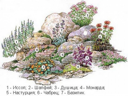 Important! Les pierres ne doivent pas être empilées trop étroitement, sinon il n'y aura pas de place pour les plantes et le développement normal de leur système racinaire. Il devrait y avoir un espace libre entre les pierres, rempli de terre.