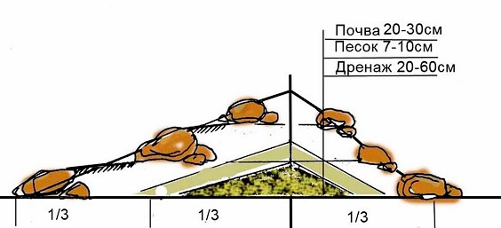 Vous pouvez maintenant procéder à l'installation des pierres. La forme idéale pour une glissade alpine est pyramidale. Les pierres sont posées en niveaux (en règle générale, de trois à six niveaux). Autrement dit, vous devez poser des pierres en gradins comme une pyramide pour simuler une pente.