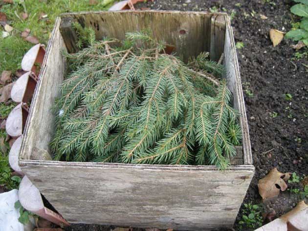 - Faites tout de même, installez un cadre en bois sur le dessus et couvrez-le de brindilles (la taille d'automne est un must!).