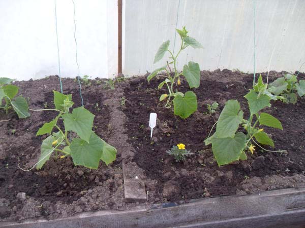 - Étape 1 - après le débarquement, préliminaire semis cultivés sur place en pleine terre (après 10-14 jours) ou pendant la période où 5-6 vraies feuilles apparaissent (si vous semé des concombres avec des graines directement dans le sol);