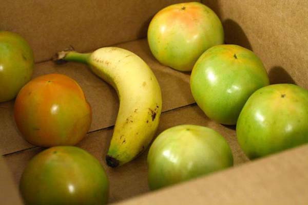 La manière la plus simple et la plus traditionnelle de faire mûrir les tomates, ainsi que tous les autres légumes et fruits non mûrs, est mettre le rouge déjà mûr parmi les fruits verts (tomates jaunes, lequel sera libère de l'éthylène gazeux et accélère la maturation (rougeur) de fruits verts.