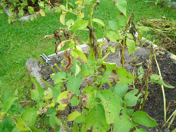 Sur la face supérieure des feuilles (en particulier dans la partie inférieure de la brousse), ainsi que dans certaines parties de la tige, petites mais en augmentation rapide taches brun foncé... En conséquence, les feuilles commencent assez rapidement à se flétrir (mourir), à noircir et à se dessécher ou à pourrir (par temps humide). En conséquence, les têtes de pommes de terre semblent brûlées.