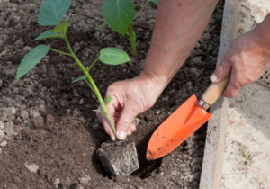 Ensuite, les fosses sont faites d'une taille telle que les plants peuvent être enterrés jusqu'aux feuilles cotylédones.