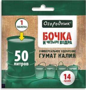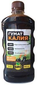 En d'autres termes, nourrir avec de l'humate de potassium n'est pas égal à l'alimentation avec du vrai engrais potassique (le même sulfate de potassium ou même la cendre de bois).