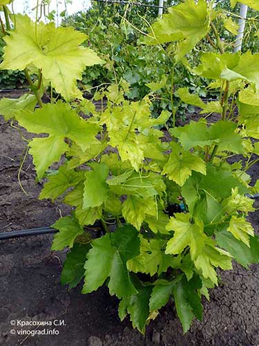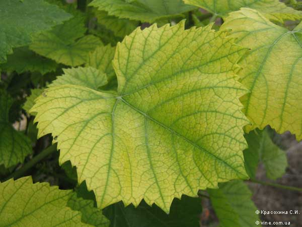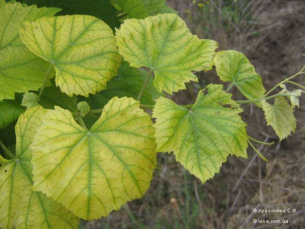 Ainsi, ci-dessous nous considérerons précisément chlorose calcaire des raisinsqui est appelée manque de ferassocié à excès de chaux dans le sol (le sol est alcalin).