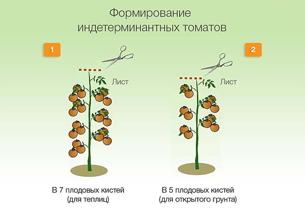 - Cependant, cela diffère limiter le point de croissance et le nombre de grappes de fruits... Donc, en grandissant 7 brosses à fruits sont laissées dans la serre près du buisson, en plein champ - 5.