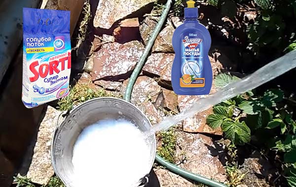 Au fond du seau, vous devez verser un peu de lessive (quelques poignées) et verser un peu (environ 2-3 cuillères à soupe) de liquide vaisselle. Ajoutez ensuite un peu d'eau, dissolvez bien jusqu'à l'obtention d'une bonne solution savonneuse. Après cela, remplissez le seau jusqu'en haut et arrosez les terriers d'ours dans le jardin.