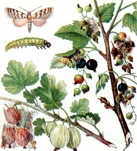 Vous ne savez pas qui mange vos groseilles à maquereau et vos groseilles? Regarde de plus près! Si les baies sont entrelacées avec des toiles d'araignées et que des chenilles vertes s'assoient dessus, alors ce n'est autre qu'une teigne de la groseille à maquereau.