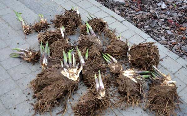 Conseil! Il est très pratique de diviser initialement les rhizomes (moins traumatisants pour les plantes) à l'aide de deux fourchettes de jardin. Ils doivent être soigneusement, bout à bout, pressés au centre de la brousse et étalés doucement dans des directions opposées.