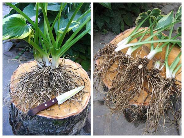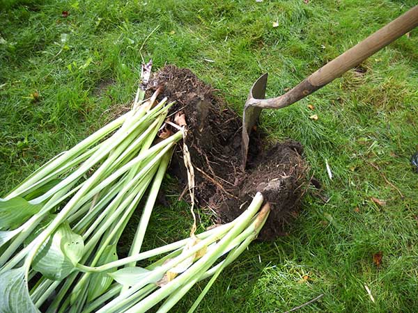Au fait! Si vous avez juste besoin de planter un morceau de l'ancienne hosta, vous n'avez pas besoin de creuser tout le buisson, mais de couper et de creuser seulement une partie.