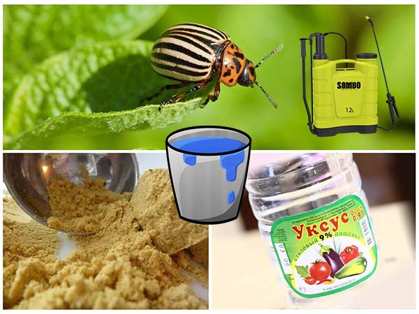 L'un des remèdes populaires les plus populaires contre le doryphore de la pomme de terre est la moutarde, ou plutôt Moutarde en poudre... Vous devez préparer la solution comme suit: prenez 1 seau d'eau, dissolvez 50 grammes de moutarde en poudre. De plus, 100 à 150 ml de vinaigre de table à 9% doivent être ajoutés à la solution. Traitez ensuite les pommes de terre avec un pulvérisateur ou la méthode à l'ancienne avec un balai.