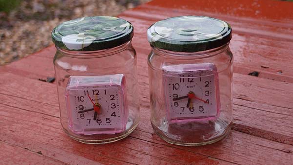 Réglez l'alarme pour une horloge, par exemple, à 12 heures, la seconde à 18 heures. Ensuite, mettez chaque réveil dans un pot de 0,5 litre et fermez bien le couvercle afin qu'aucune eau ne puisse pénétrer à l'intérieur. Enterrez dans différents côtés de votre chalet d'été. Ainsi, le réveil de chaque montre sonnera et effraiera ainsi les taupes du site 4 fois par jour.