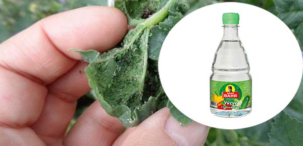 L'un des remèdes populaires efficaces dans la lutte contre les pucerons sur les feuilles de concombre est le vinaigre. Pour préparer une solution pour le traitement des plantations, vous devez prendre 1 cuillère à soupe. cuillère d'acide acétique et dissoudre dans 1 litre d'eau, ajouter 1 cuillère à soupe. une cuillerée de savon à lessive râpé ou autre détergent (7 à 10 gouttes).