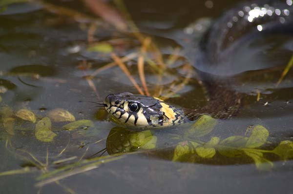- Déjà Est un reptile avec des taches jaunes (oreilles), et pour les humains il sûr... Habituellement, vers août, de jeunes serpents rampent hors des nids de la mère. Les jeunes serpents peuvent ramper autour de votre site, puis trouver leur place plus près du réservoir.