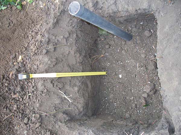 Conseil! En creusant un trou laisser de côté la couche de sol fertile supérieure (à proximité): vous en avez toujours besoin, mais le plus bas n'est plus nécessaire (bien qu'il soit possible de spud le plant après s'être caché pour l'hiver).