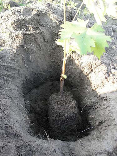 Important! Si à l'atterrissage semis en pot raisins (c'est-à-dire avec un système racinaire fermé) vous violé sa masse terreusealors tu as besoin arracher toutes les feuilles, sinon le plant pourrait ne pas prendre racine. Si la motte de terre est complètement préservée, il n'est pas nécessaire de la couper.