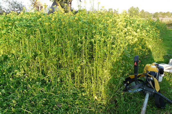 Ainsi, en règle générale, une fois que l'engrais vert a poussé et atteint une hauteur de 30 à 40 cm, il est tondu au niveau du sol, par exemple avec une houe ou un cutter plat, ou peut-être avec une tondeuse.