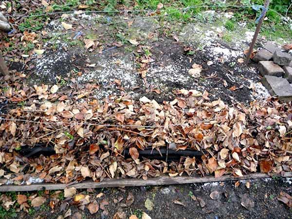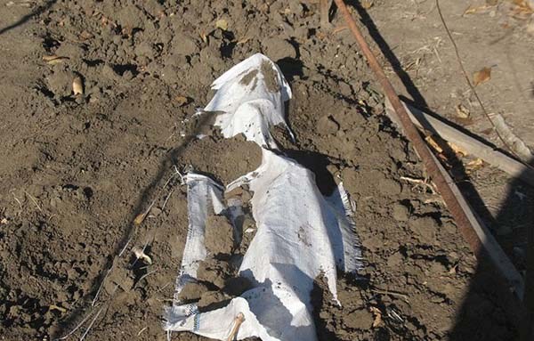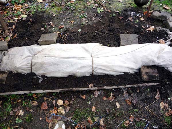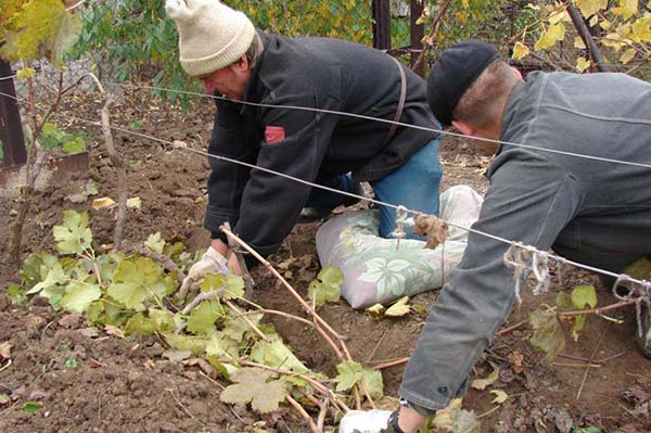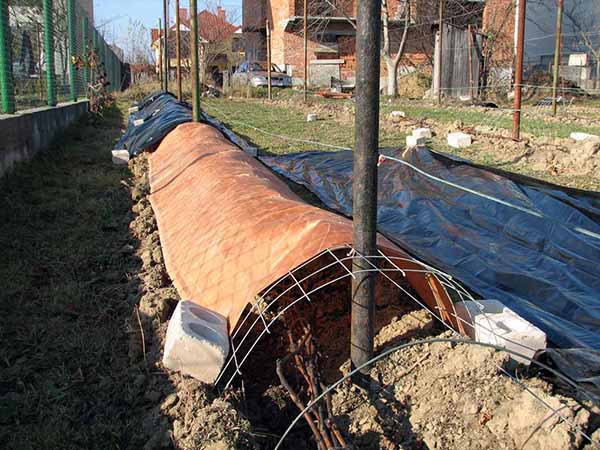 Le moyen le plus simple et le plus naturel de cacher les raisins est de les enfouir dans le sol. Le moment venu, vous devez remplir la vigne précédemment épinglée d'une couche de terre de 20 centimètres, qui doit de préférence être sèche, c'est-à-dire préparée à l'avance. Ou vous pouvez prendre le terrain directement depuis les allées.