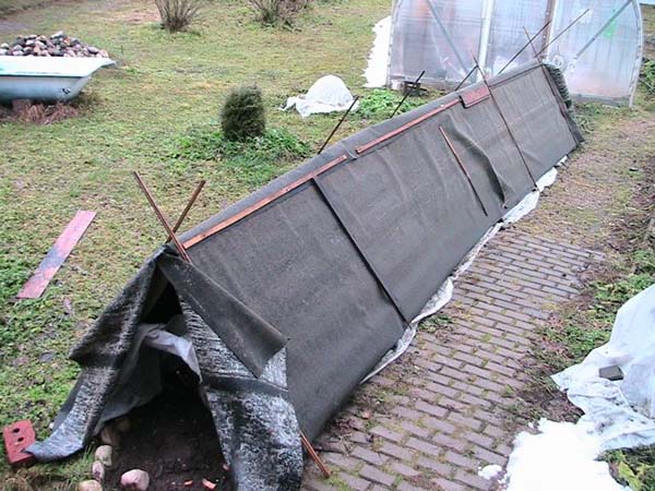 Mais en général, les feuilles et la paille sont généralement utilisées comme matériau de paillage, pour une meilleure conservation de la chaleur, et des arcs sont déjà installés sur le dessus, sur lesquels un matériau de couverture résistant à l'humidité est posé.