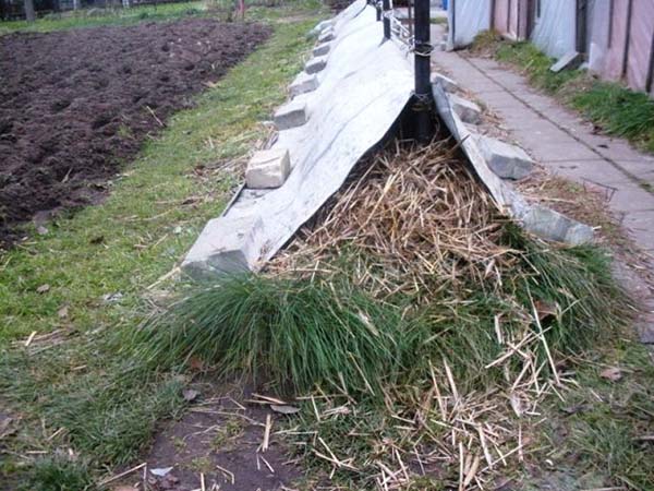 Placez simplement les raisins sur le sol et couvrez feuilles d'ardoise ordinaire... En option, pour une isolation supplémentaire, vous pouvez verser du foin sec et des feuilles sur le dessus de l'ardoise.