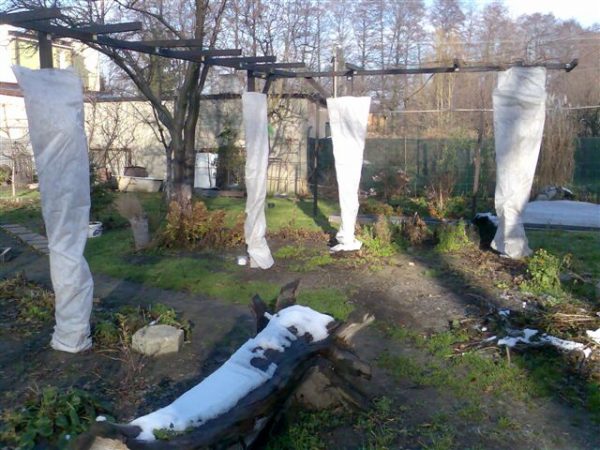 S'il est nécessaire de couvrir, vous pouvez essayer d'envelopper la vigne dans un matériau non tissé ou en agrofibre directement en position verticale.