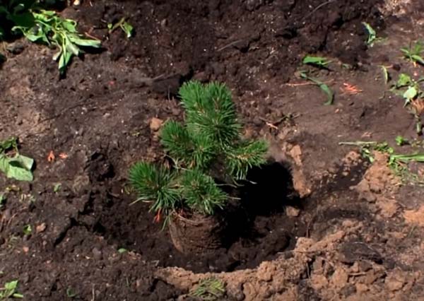 Conseil! Si vous avez une zone désertique, lors de la plantation, il est conseillé d'arroser en plus le plant avec la racine. Et un mois plus tard, nourrissez le pin avec des engrais spéciaux pour les conifères.