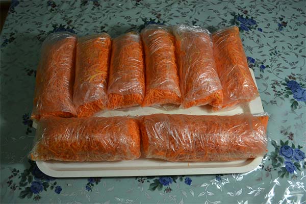 La technologie de préparation des carottes pour la congélation est similaire: lavées, pelées, frottées sur une râpe grossière, placées dans des sacs ou des récipients pour la congélation et mises au congélateur.