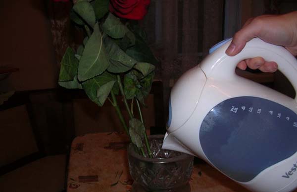 Il existe un autre moyen de raviver les roses fanées: renouveler la coupe, puis tremper les pointes renouvelées des tiges dans de l'eau bouillante pendant 2-3 minutes, puis les placer dans un bain d'eau froide pendant 6-8 heures (toute la nuit). Dans un sens, ce sera une sorte de traitement de choc.
