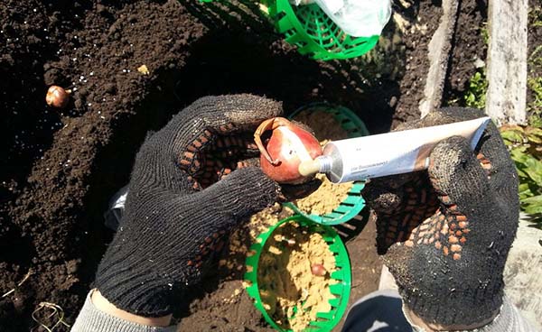 Important! Ne traitez pas les bulbes eux-mêmes, mais il vous suffit de verser de la sciure de bois humidifiée avec du goudron dans le trou lors de la plantation.