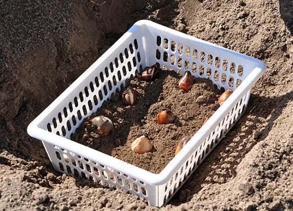 La méthode la plus populaire et la plus moderne pour protéger les tulipes ou les lys des souris consiste à planter des bulbes dans paniers ou conteneurs spéciaux (vous pouvez même prendre le plus ordinaire caisses à légumes en plastique).
