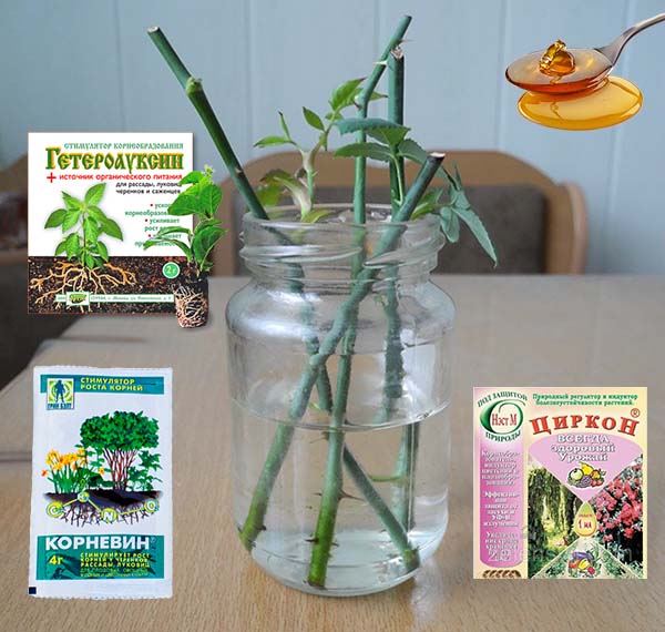 Pour un meilleur enracinement, il est conseillé de maintenir les boutures de roses dans l'une des solutions ou des moyens spéciaux pour la formation des racines avant la plantation. Par exemple, vous pouvez mettre les boutures dans solution de miel (1 cuillère à café dans 1 verre d'eau) pendant 10 à 12 heures ou plonger dans Solution Kornevin (selon les instructions). Aussi pour de meilleurs résultats, vous pouvez plonger pendant 12 heures dans solution de "Hétéroauxine" (50 mg pour 1 litre d'eau) ou "Zircon " (0,1 mg pour 1 litre d'eau). Bien que des fleuristes expérimentés proposent également cette option: il suffit de tremper légèrement la partie inférieure de la coupe dans de la poudre Kornevin ou Heteroauxin.