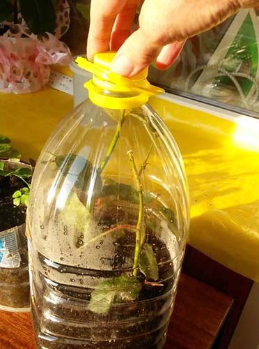 Après un certain temps (après environ 4-5 semaines), lorsque les racines se forment déjà à la bouture (cela se traduira par l'apparition d'une nouvelle petite feuille), vous devriez commencer aérez progressivement votre serre avec une tigeouvrir le couvercle, tout en augmentant l'heure chaque jour. Ensuite, le couvercle peut être complètement retiré. C'est pourquoi il est très pratique d'utiliser le haut de la bouteille en plastique.