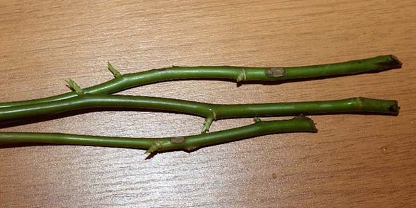 - Il est important de déterminer si la rose a reins bien développés (2-3 reins), qui sont situés à l'aisselle des feuilles (entre-nœuds au-dessus des feuilles). S'ils ne sont pas là, puisqu'ils sont déjà devenus noirs et sont morts de rester longtemps dans l'eau, il ne fait aucun doute qu'une telle tige nue sans bourgeons ne nous convient pas.