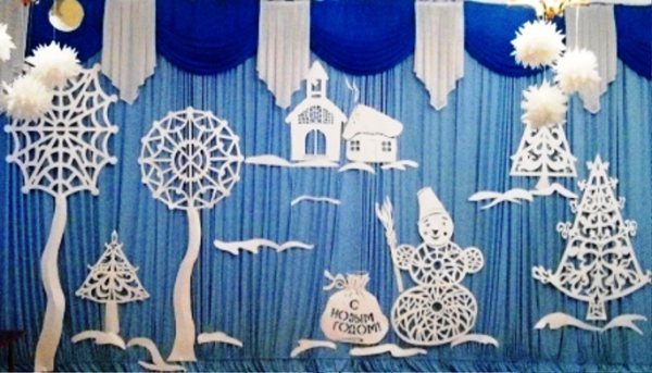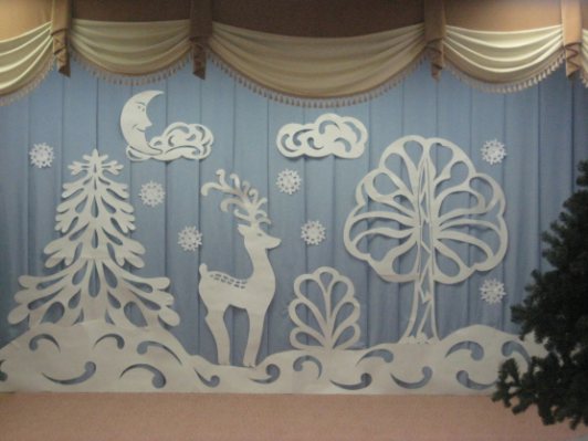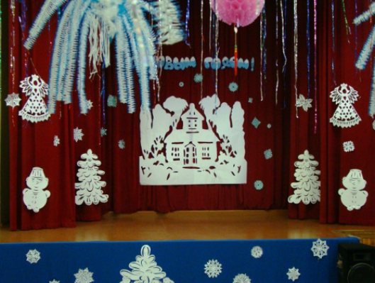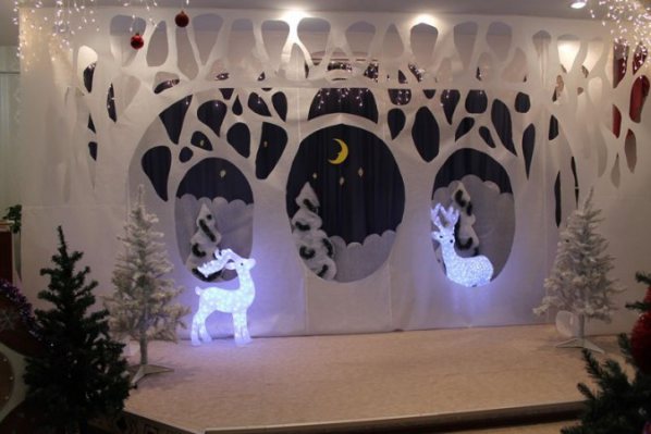 Si la direction de l'école est fidèle à l'activité des élèves et les encourage, elle organise des concerts à thème festif qui se déroulent dans la salle de réunion de l'école, sur scène. Pour rendre le concert scolaire plus artistique et mémorable pendant longtemps, il faut le faire à l'écoledécoration de scène pour la nouvelle année. Vous pouvez etUtilisez un grand sapin de Noël au milieu de la scène, des flocons de neige, des guirlandes et de la pluie sur le rideau et du tissu au fond de la scène. L'inscription «Bonne année!», Symboles des silhouettes de nouvel an, découpée dans du papier ne sera pas superflue.