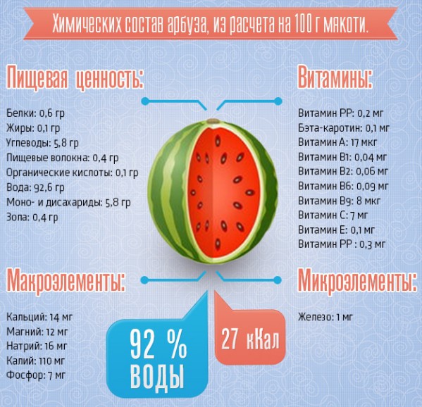 La baie contient des vitamines des groupes B, A, C, E, ainsi que du fer, du potassium, du calcium, du magnésium, du phosphore. La pastèque a des propriétés bénéfiques telles que le nettoyage du foie, des reins, l'amélioration du métabolisme, la réduction du cholestérol et le renforcement général du corps.