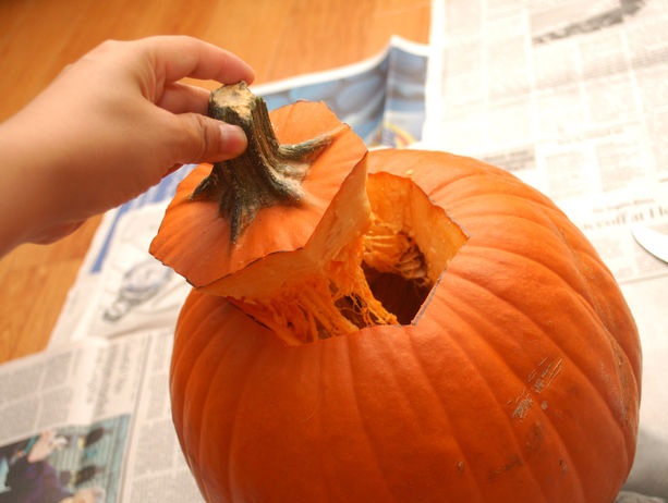 - Étape 1. Vous devez d'abord décider comment vous souhaitez éclairer la lanterne de l'intérieur... Si vous voulez faire une décoration de citrouille d'Halloween avec une bougie, vous devez faire un trou sur le dessus. Pour ce faire, coupez un morceau en forme de cône par le haut afin que le couvercle ne tombe pas à l'intérieur. S'il y a une guirlande ou une lampe de poche à l'intérieur, il est préférable de couper le bas.