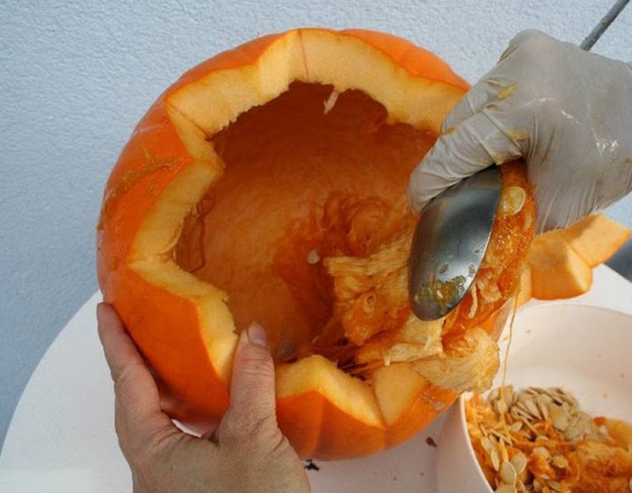 - Étape 2. Ensuite, vous devez nettoyer la citrouille pour Halloween... Tout le contenu en est retiré: os, pulpe, partie interne de la peau. Un couteau, une cuillère ou un grattoir est utilisé pour peler une citrouille d'Halloween. Le moyen le plus pratique de faire le ménage avec vos mains, cette option convient à ceux qui n'ont pas peur de se salir. Grattez soigneusement où sera le «visage» de la citrouille. Cela facilitera la coupe.