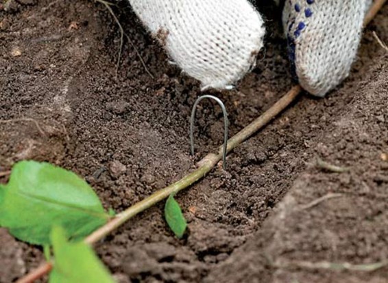 - Ensuite, les pousses latérales d'un arbuste annuel sont abaissées au sol et placées dans ces rainures.