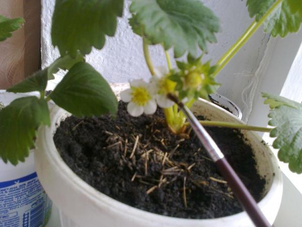 Pour qu'après la floraison des baies, il est recommandé de polliniser les fraises. Il existe plusieurs façons de polliniser artificiellement à la maison: