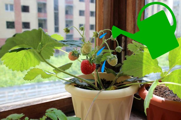 En règle générale, il suffit d'humidifier le sol dans les contenants de fraises sur le rebord de la fenêtre 2 fois par semaine. Il est préférable d'hydrater le sol l'après-midi. Après l'arrosage, le sol dans le bac de plantation est ameubli.