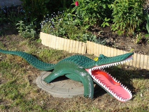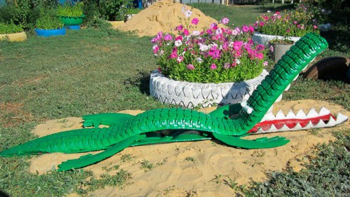 Les prédateurs dangereux dans la nature peuvent devenir de jolis petits animaux à cause des pneus de votre maison de campagne. Les structures vertes auront l'air organiques à côté des fleurs, des arbustes et des arbres.