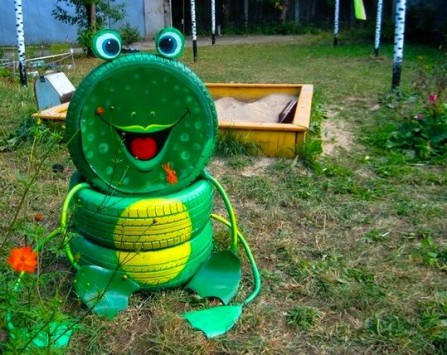 Ce sont les grenouilles d'argile qui décorent très souvent les chalets d'été. Les beautés vertes s'intègrent parfaitement dans l'environnement du jardin. Mais les grenouilles faites de pneus en caoutchouc auront également l'air extraordinaire.