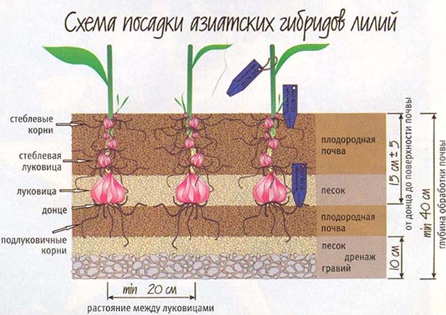 Conseil! Vous pouvez faire une litière multicouche pour une meilleure croissance des bulbes de lys. Versez de la terre ordinaire, puis fabriquez un oreiller de sable de rivière sur lequel poser le bulbe lui-même et recouvrez-le du même sol.