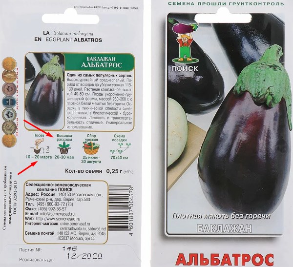 Au fait! Chaque paquet de graines, ou plutôt sur son verso, contient de brèves informations sur la culture, où, en règle générale, des recommandations générales sont données sur le moment des semis pour les semis de cette variété (hybride) d'aubergine.