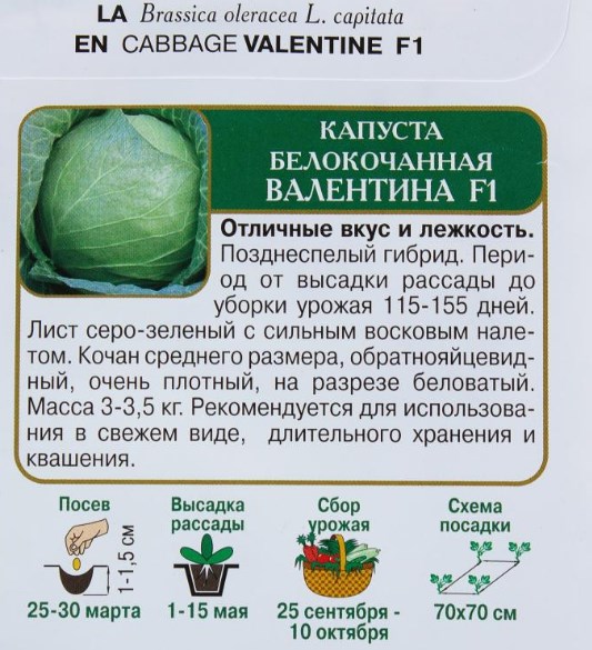 Exemple d'instructions de plantation et de calendrier sur l'emballage du chou blanc tardif du populaire hybride Valentine F1:
