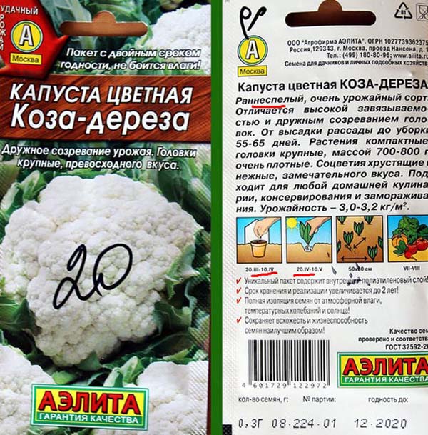 Un autre exemple d'instructions de plantation et de calendrier sur l'emballage du chou-fleur précoce de la variété populaire "Goza Dereza":