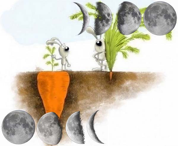 En d'autres termes, ce qui pousse au-dessus du sol (tomates, poivrons, aubergines, concombres) est planté lorsque la lune grandit. Au contraire, ce qui pousse vers le bas, sous terre (racines - carottes, betteraves, navets), est semé sur la lune décroissante.