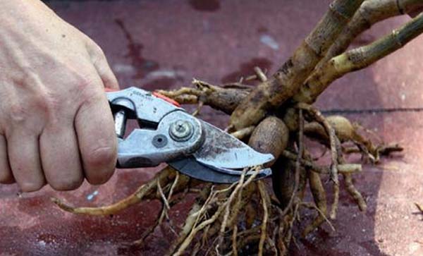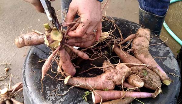 - Maintenant tu as besoin couper toutes les racines minces avec des ciseaux ou un sécateurqui poussent à partir de tubercules afin qu'ils ne disparaissent pas pendant le stockage.