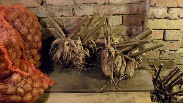 Important! Si les racines commencent à sécher sensiblement pendant le stockage et que les tubercules se froissent (vous pouvez vérifier avec votre main), la sciure / le sable peuvent être légèrement saupoudrés d'eau.