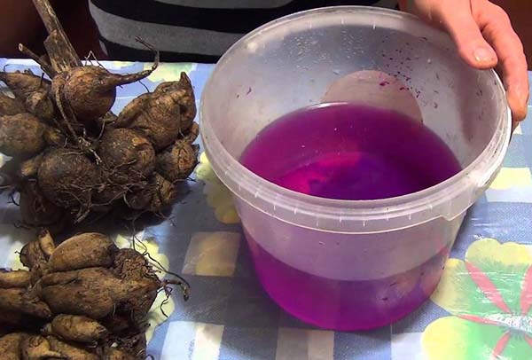 Avant la pose pour le stockage, de nombreux jardiniers recommandent de traiter les tubercules de dahlia dans des préparations spéciales pour la prévention des maladies. Fongicide le plus couramment utilisé "Maxime" ou «Fitosporin». Et à l'ancienne, vous pouvez cuisiner psolution ozique de permanganate de potassium... Les rhizomes sont conservés dans l'une de ces solutions pendant 20 à 30 minutes ou vaporisés à partir d'un vaporisateur de tous les côtés.